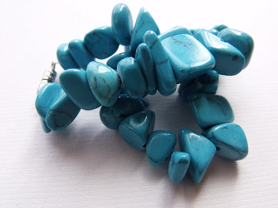 I have a friend who is in a wedding and needed some bright jewelry. I said I would be happy to help and we went to the local craft store and chose out some turquoise. It all includes a necklace (somewhat heavy), a matching bracelet and of course some earrings. Nothing makes you feel more put together than a jewelry set- or at least I think so. 🙂